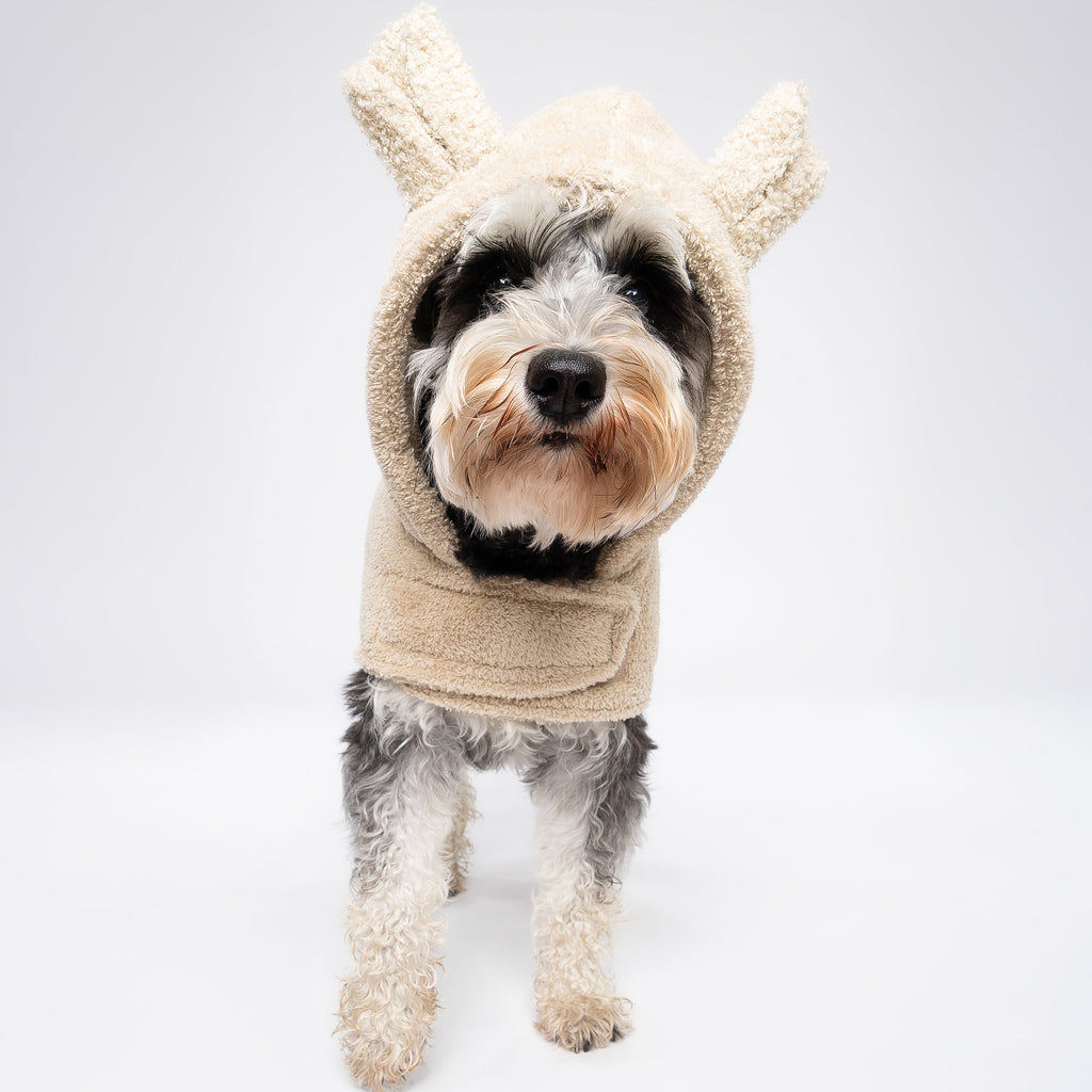 The little teddy ears are adorable, and my pup actually enjoys wearing it after baths.