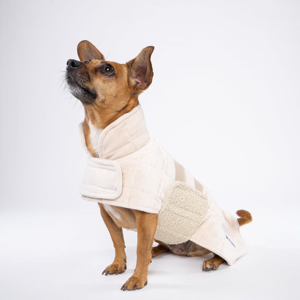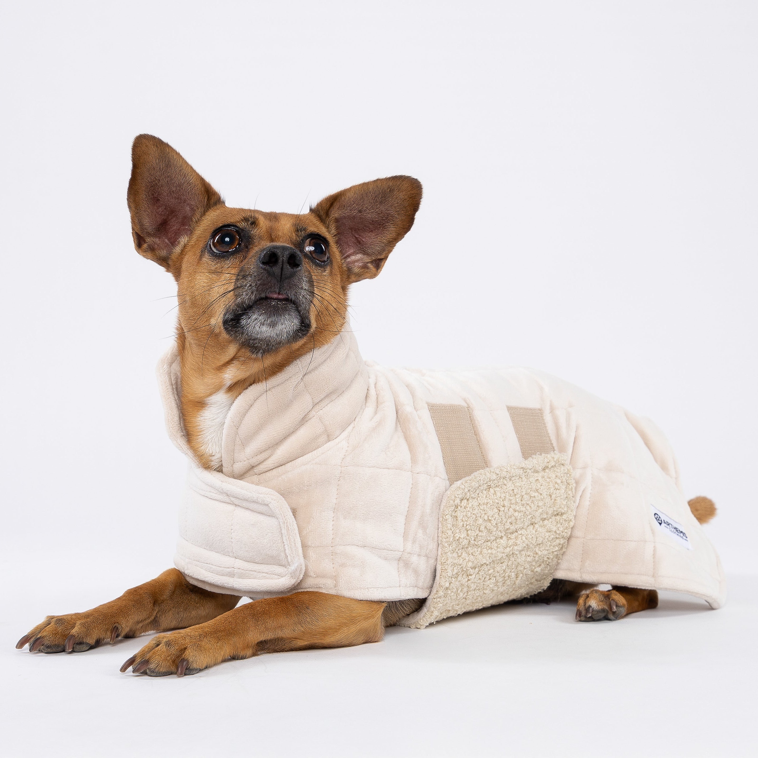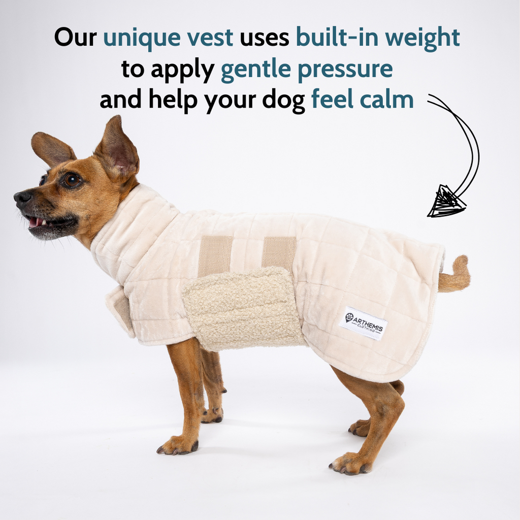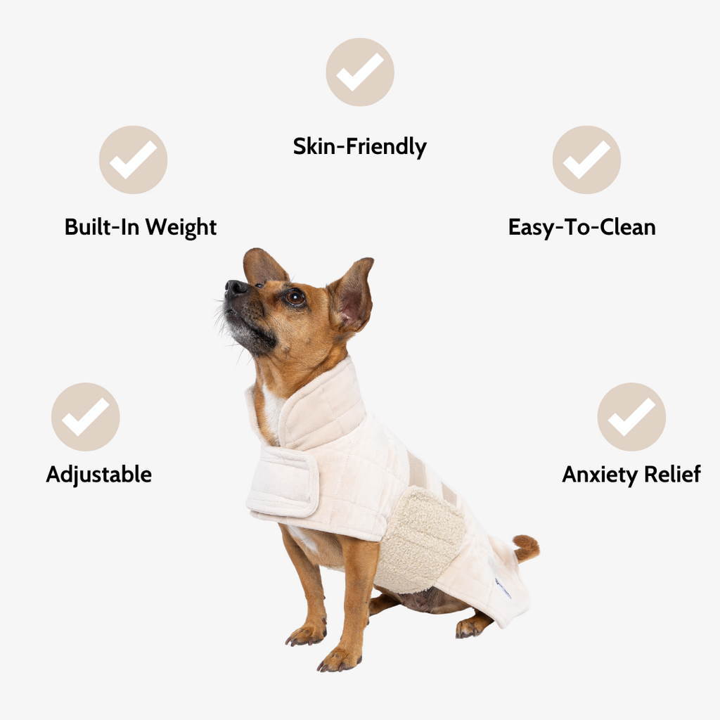 This unique calming vest uses built-in weight to apply gentle, evenly distributed pressure across your dog’s body.